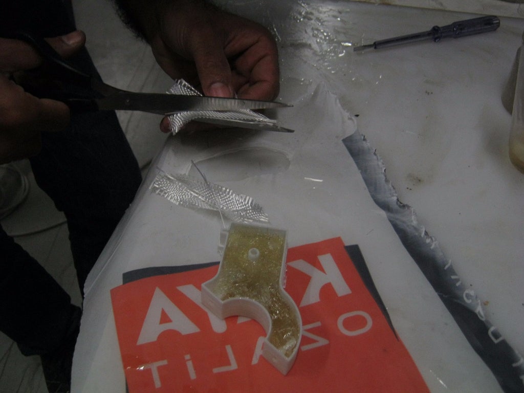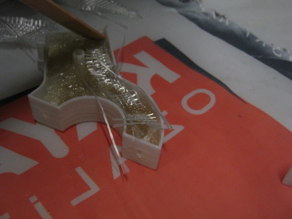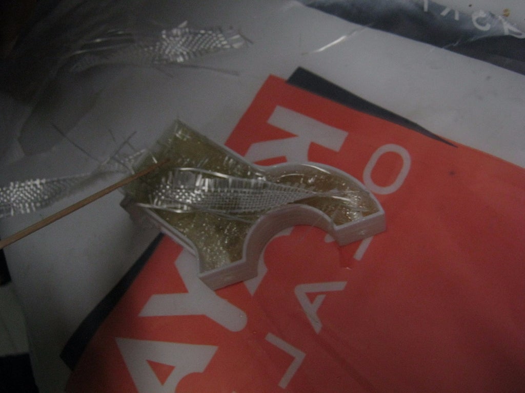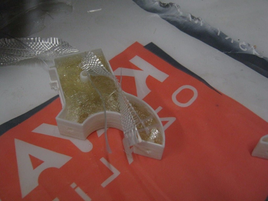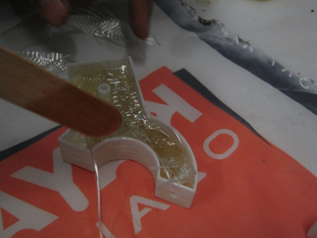 Continued this until all fabric inside is wet and then added more fabric and epoxy step by step making the inside of the part is full. Then Screwed the round part on top of it. I continued filling the part, rising the level of epoxy-fiber mixture to the edge.