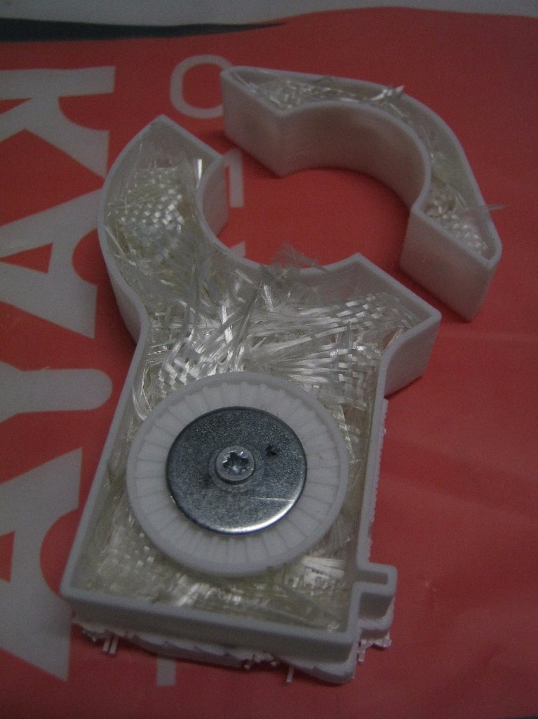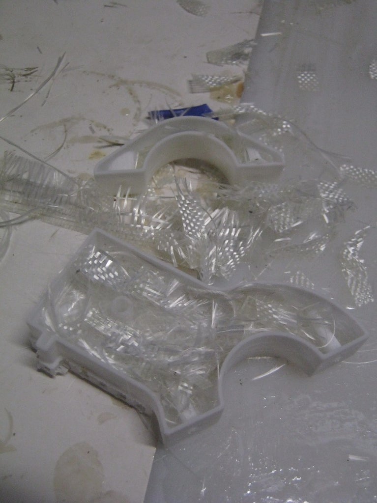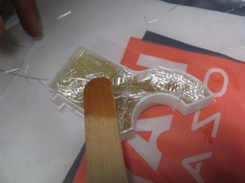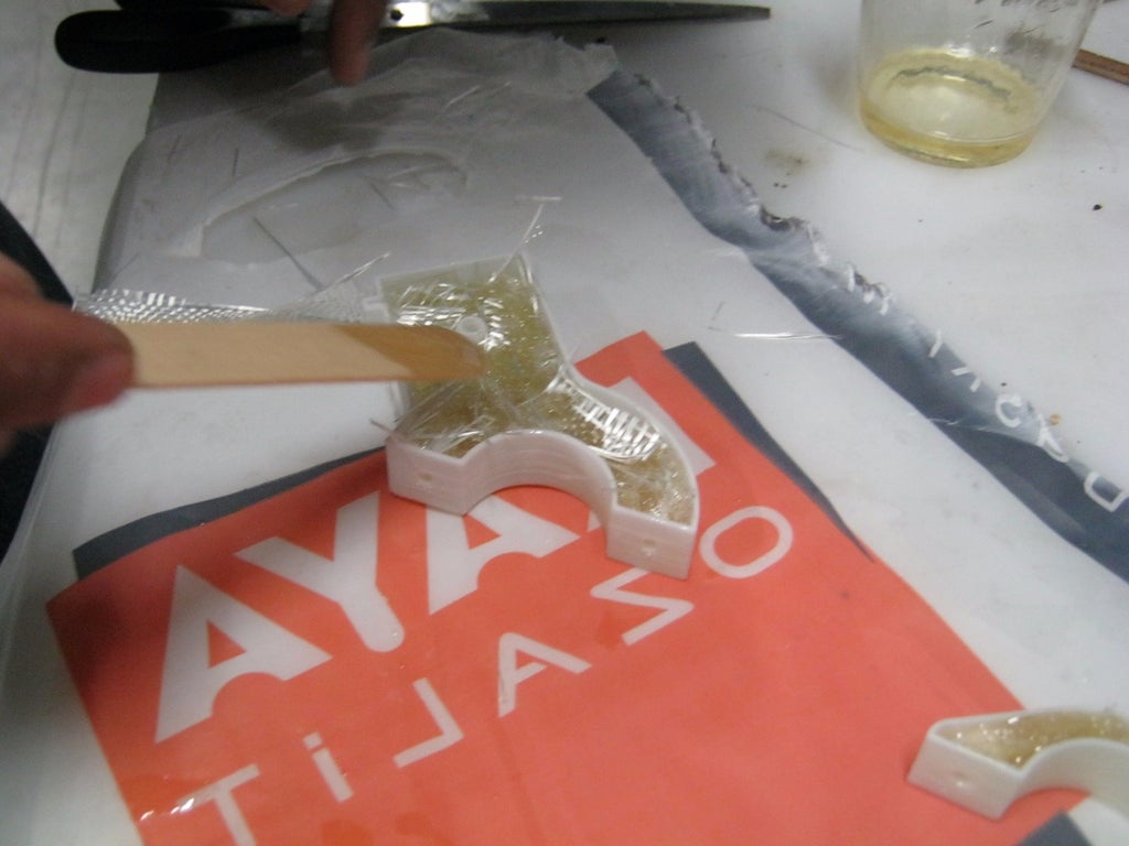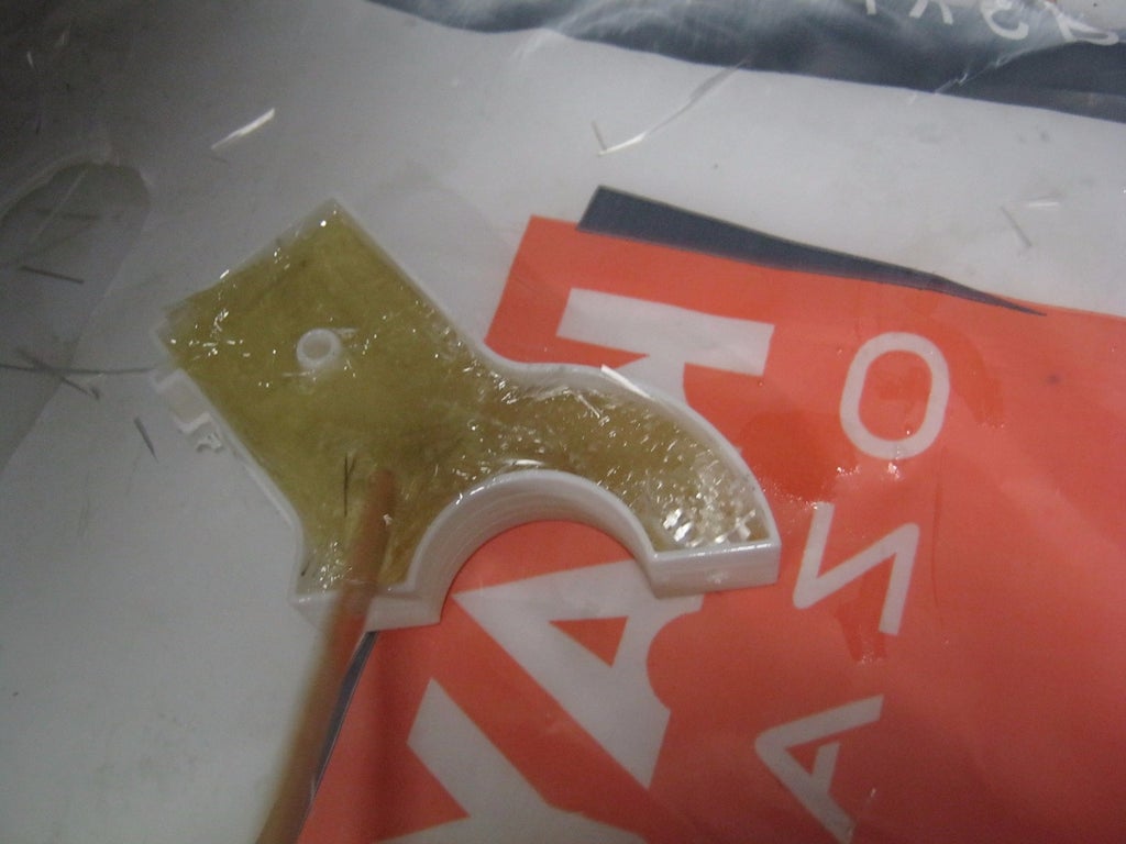 Continued this until all fabric inside is wet and then added more fabric and epoxy step by step making the inside of the part is full. Then Screwed the round part on top of it. I continued filling the part, rising the level of epoxy-fiber mixture to the edge.