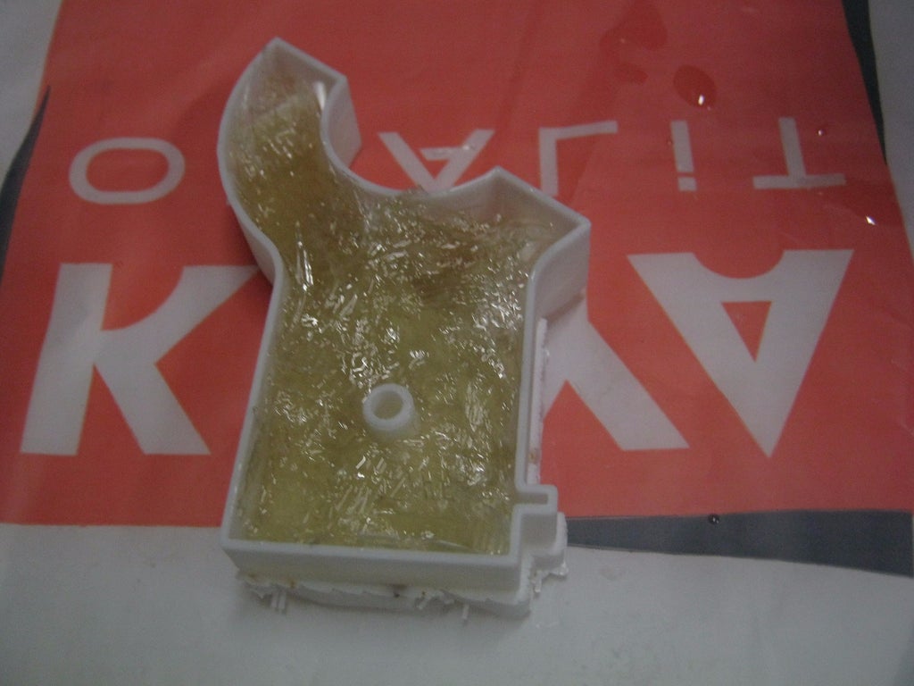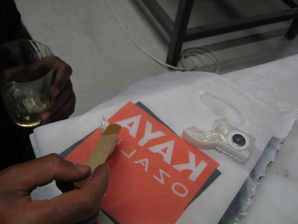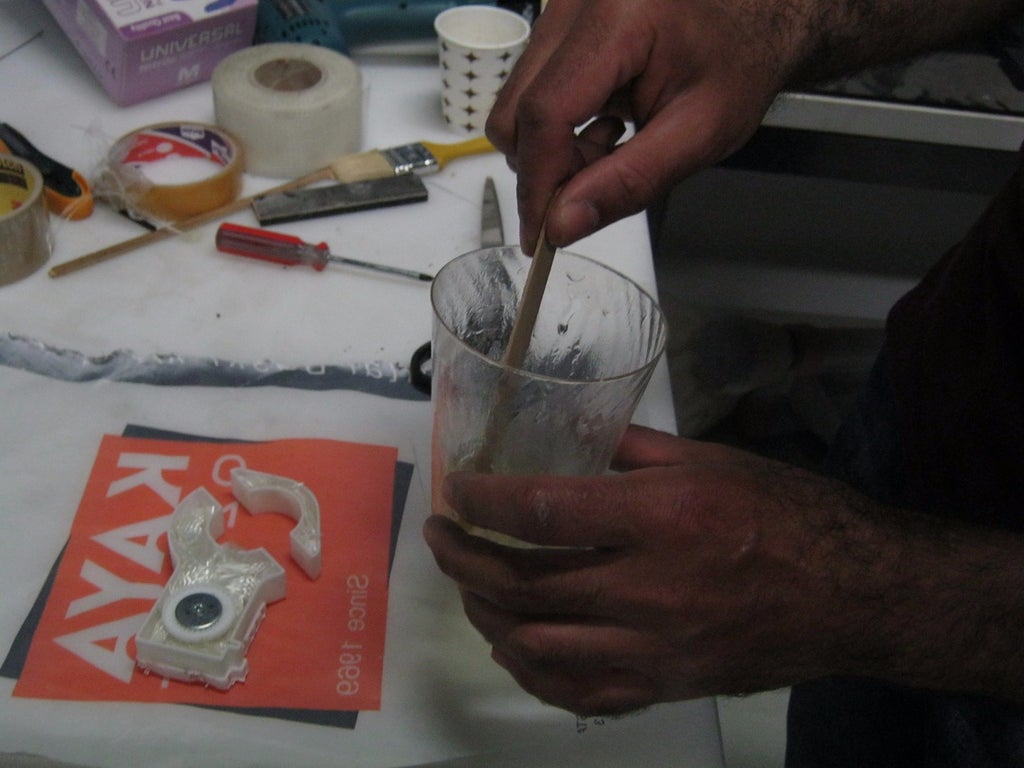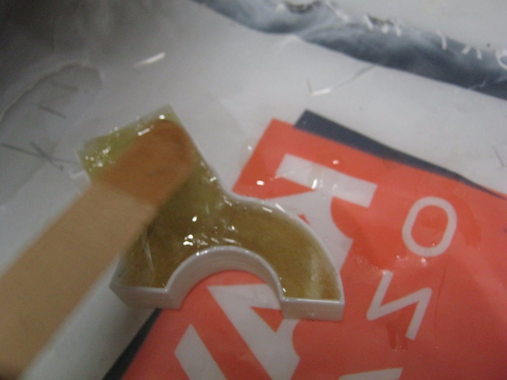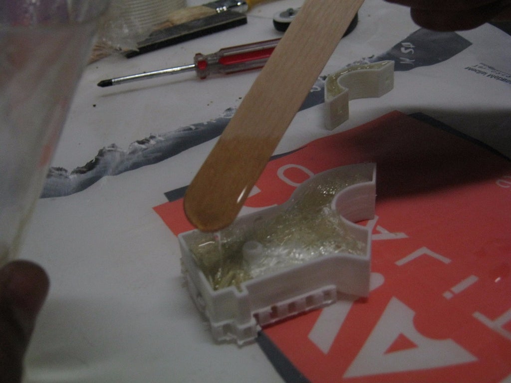 First I shredded some amount of fiberglass and stuffed them into both of the parts until they are more than half full. Then started pouring small drops onto them and applying a bit of pressure to soak them.