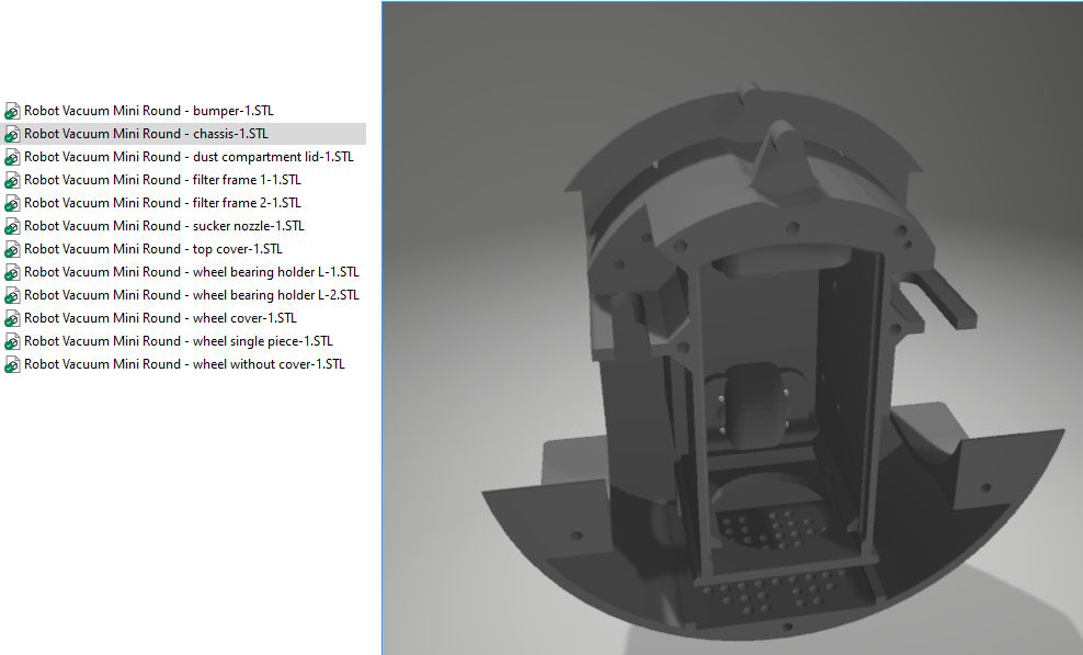 Here is a new robot vacuum for you. It is a mini with 150mm diameter so 3d printer friendly. Can be produced with most printers in one piece. Easy to assemble and produce by using reasonably priced standard parts. Get it and enjoy.