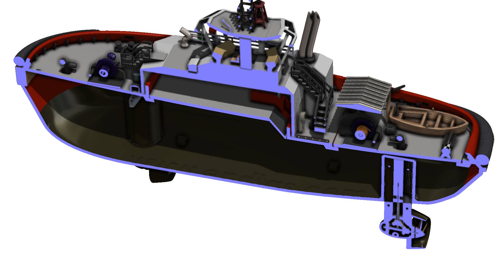 The internal structure is mostly hollow, maintaining consistent wall thickness for strength and print efficiency, while the hull design provides ample internal space for builders interested in RC conversion or lighting customization. The geometry is smooth yet detailed, replicating the clean lines and purposeful form of a modern high-performance tugboat.