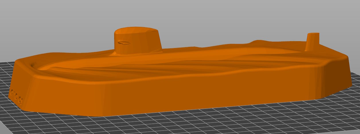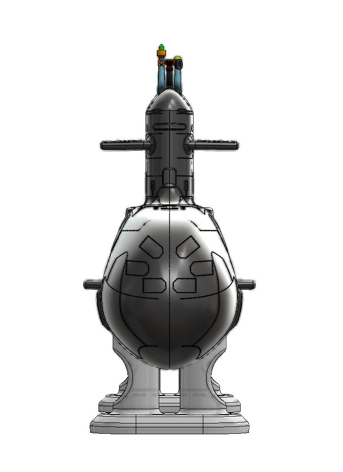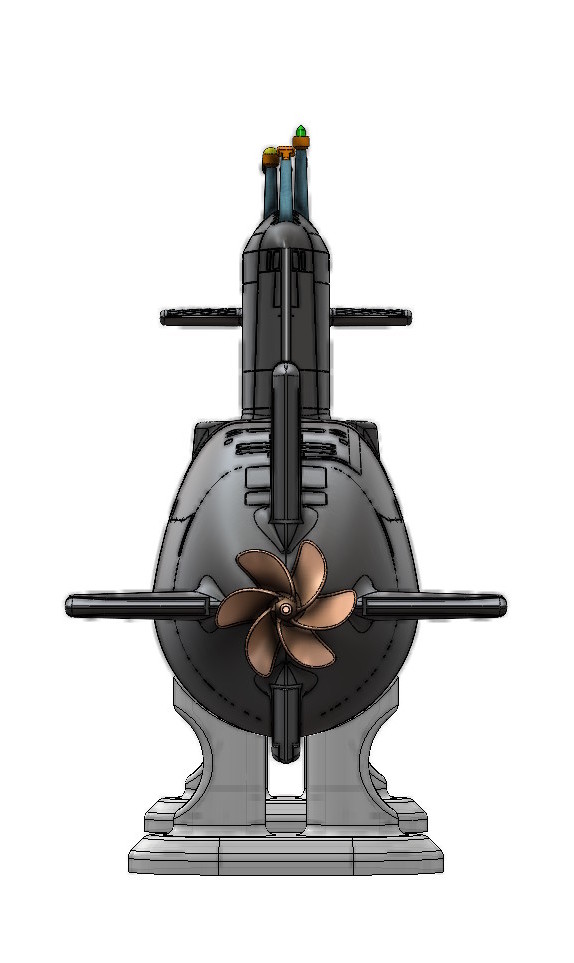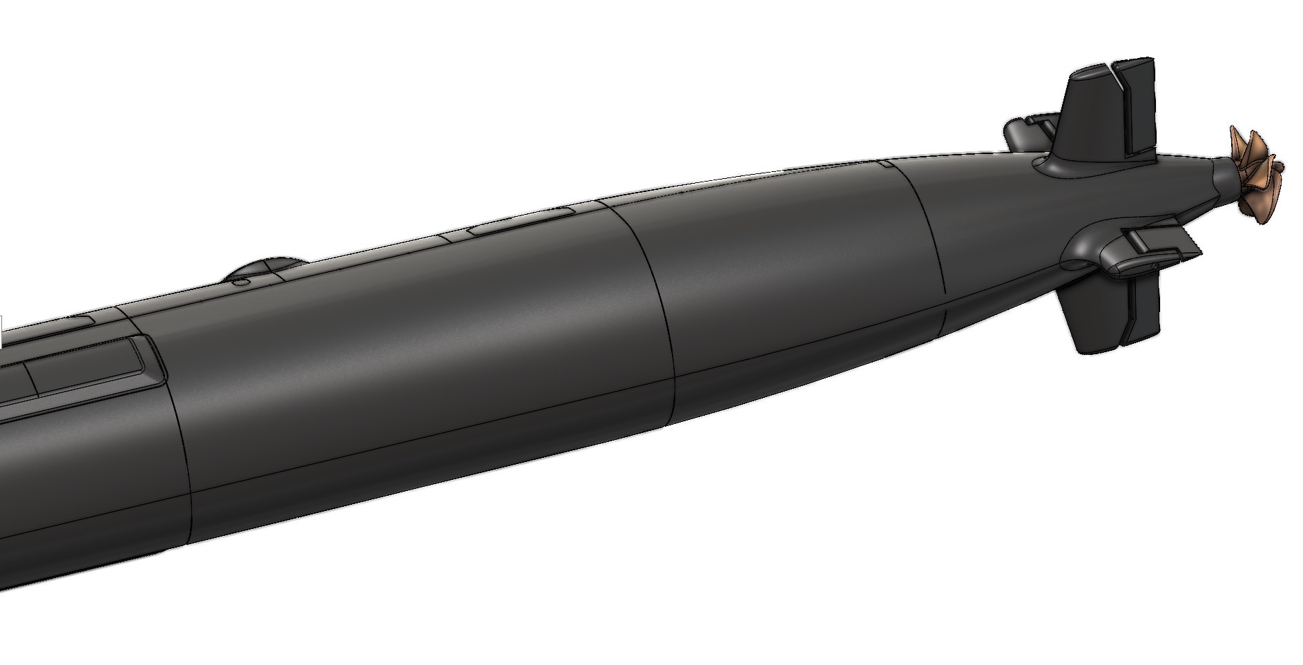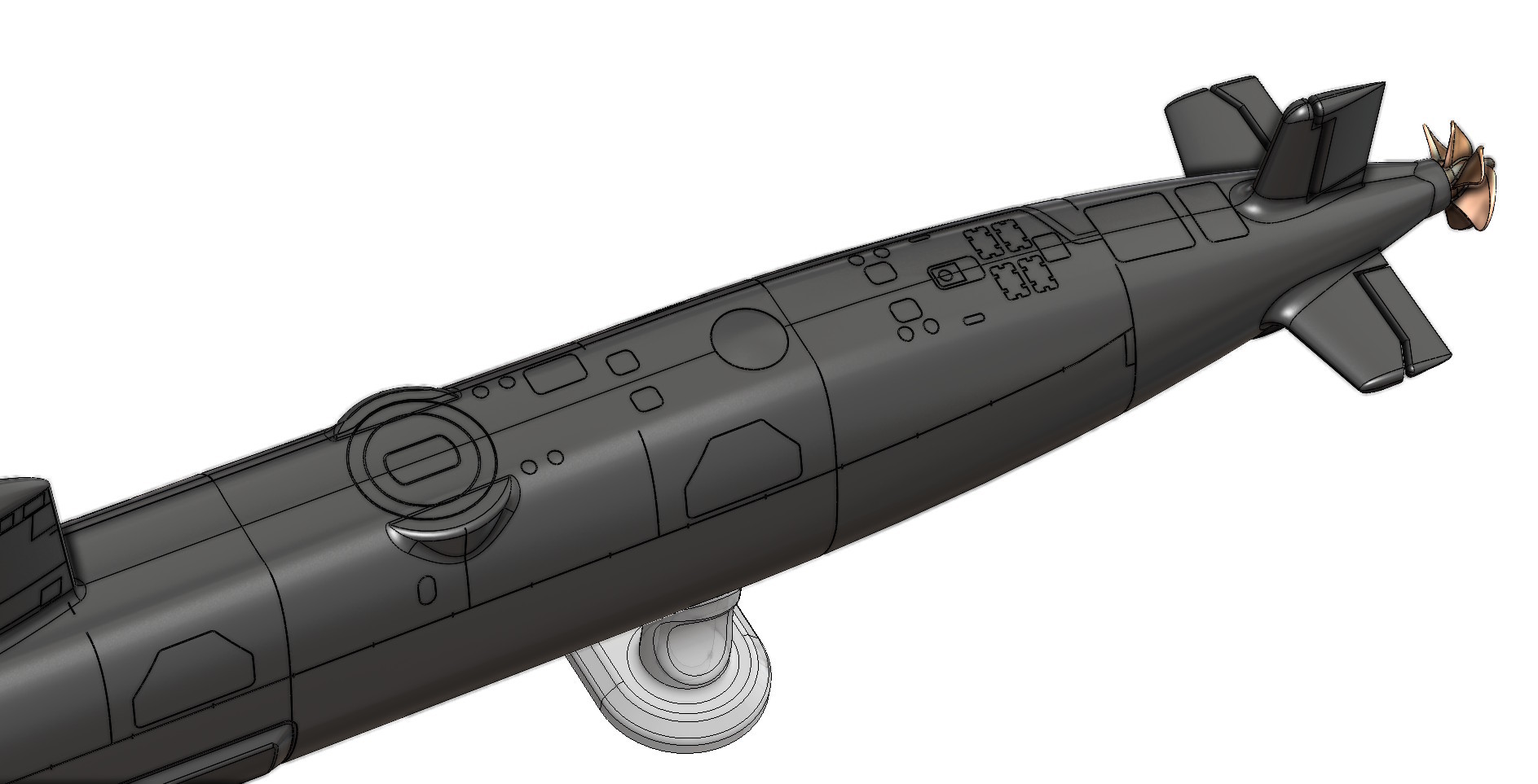 The exterior of the high-detail model features engraved surface textures and panel lines, each 0.25 mm deep and thick, built directly into the hull geometry. These lines print seamlessly with the hull sections, requiring no manual work, yet they significantly enhance the realism and visual depth of the finished submarine. Every curve, seam, and opening has been recreated to maintain scale accuracy while ensuring a smooth print on most machines.