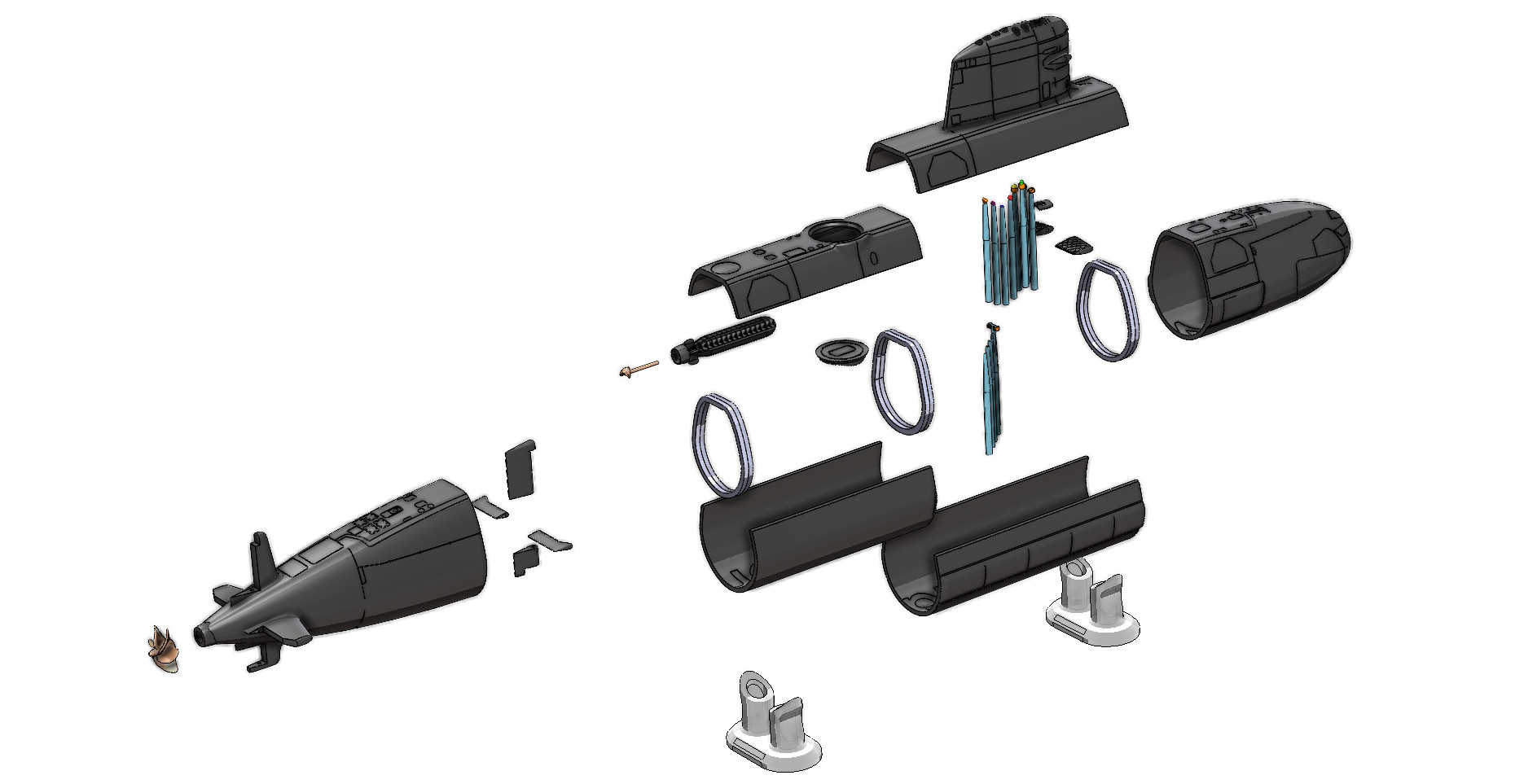 We recommend printing the Scorpène-class submarine at a 0.16–0.20 mm layer height to achieve a fine surface finish and efficient build time. The model is optimized for FDM printers, though smaller components such as the control surfaces and propellers can also be printed in resin for maximum precision. A 15–20% infill provides ample strength, while the three internal bulkheads guarantee perfect alignment and hull stability. The movable control surfaces may require light sanding or tolerance adjustments for smooth operation.