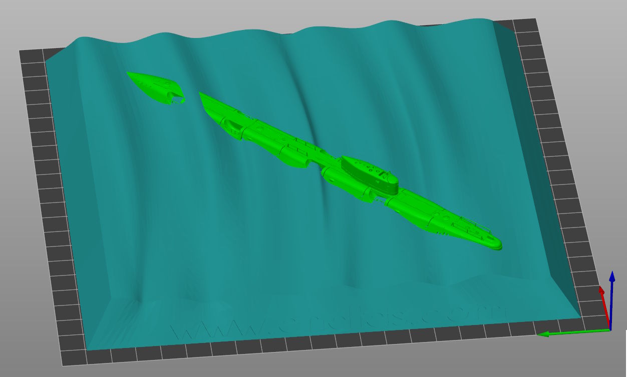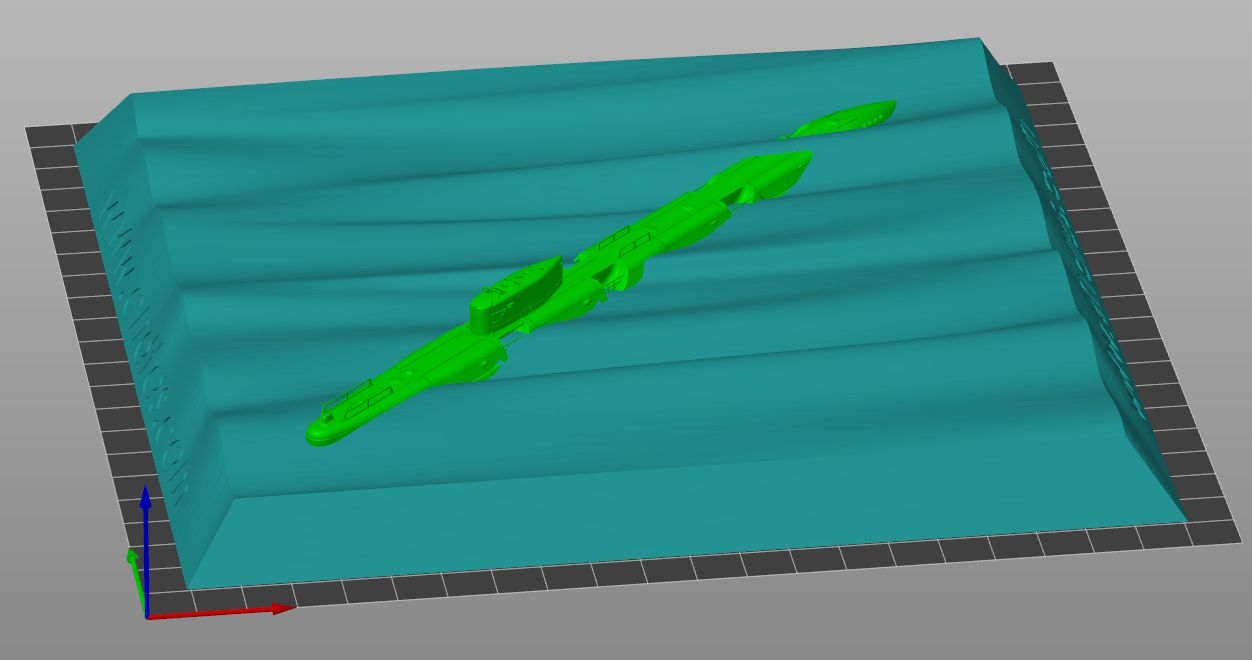 For those who prefer a quicker and more compact project, there is also a single-piece desktop version of the Echo Class submarine, depicted cruising through moderate waves. This version is designed for easy printing without assembly, making it suitable for desk ornaments, teaching props, or naval collectibles. It is best printed in PLA or PETG with 0.16–0.2 mm layer height and 10–15% infill, and can be finished with paints to enhance its wave details and hull lines.
